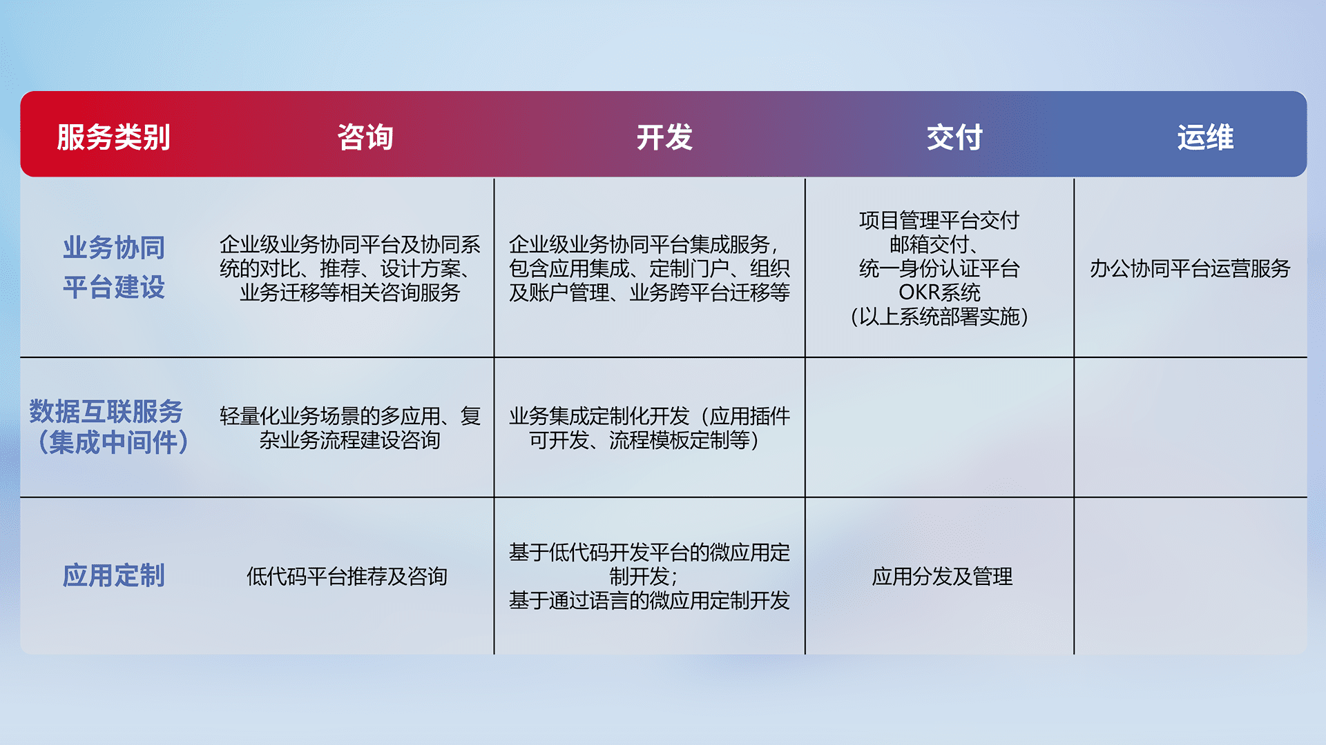 针对钉钉、、、企微、、、、IDaas等平台级产品提供产品的规划、、、、方案、、、交付、、、定制化开发等服务,,实现如统一协同办公、、、智能客户服务、、、、混合会议管理、、、智能数据查询、、等业务场景,,实现数字化转型。。。